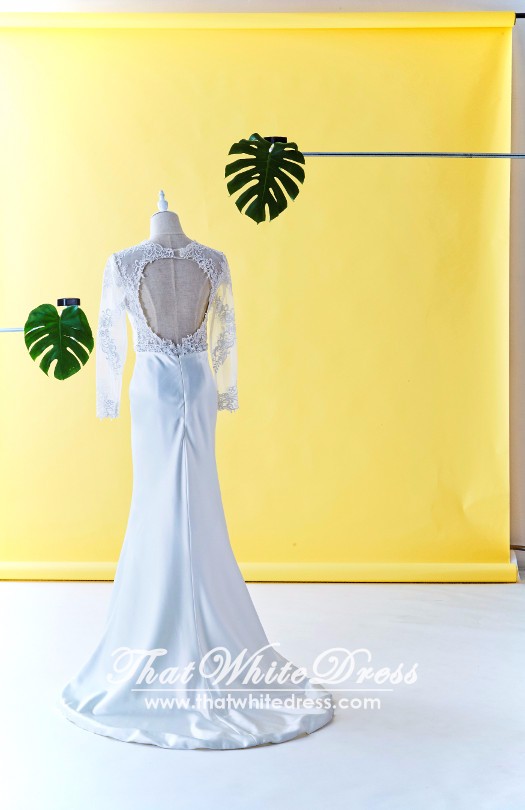 408W06 LL Berta Minimalist Long Sleeves Belgian Guipure Lace Lace Sheath Straight Cut in Silk Satin Wedding Dress Gaun Baju Pengantin Muslimah Kahwin Nikah Sanding Malaysia Kuala Lumpur Petaling Jaya