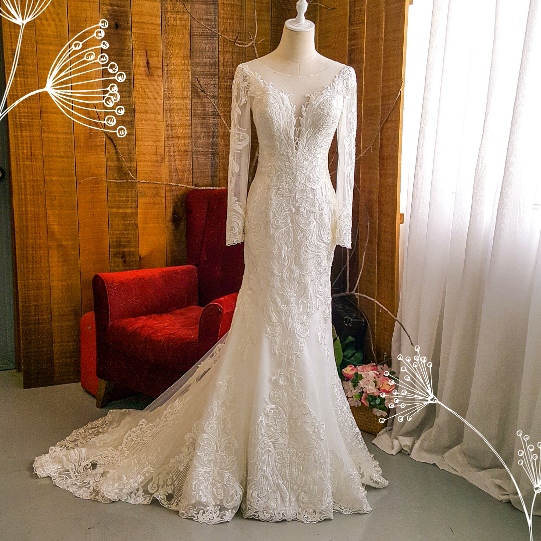 408W10 French Chantilly Lace Long Sleeves Champagne Wedding Dress Mermaid Trumpet Baju pengantin Kahwin Malaysia Muslimah bride