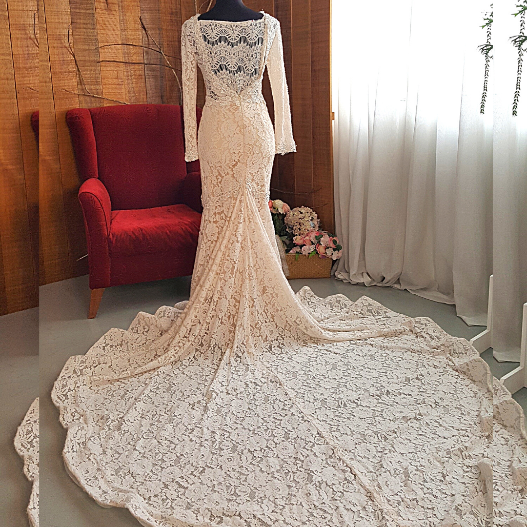 Long sleeves wedding dress in Full French Chantilly lace with champagne lining.