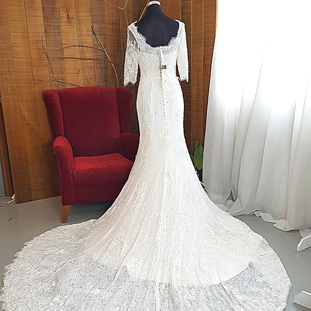 Couture design long sleeves boat neck wedding dress in trumpet style with gorgeous full Chantilly lace.