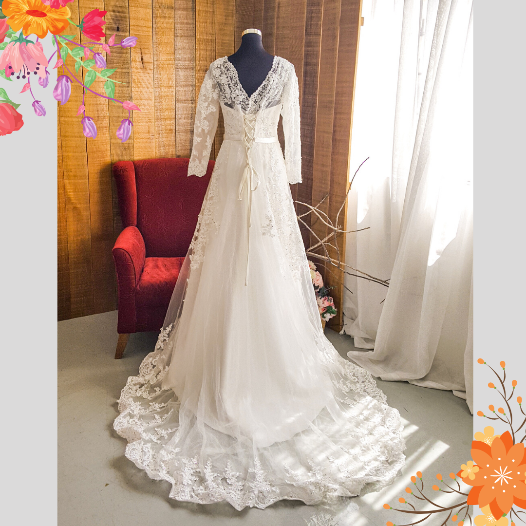 Featuring a beautiful lace embroidery with elegant beading details, this gorgeous wedding dress is both elegant and timeless!