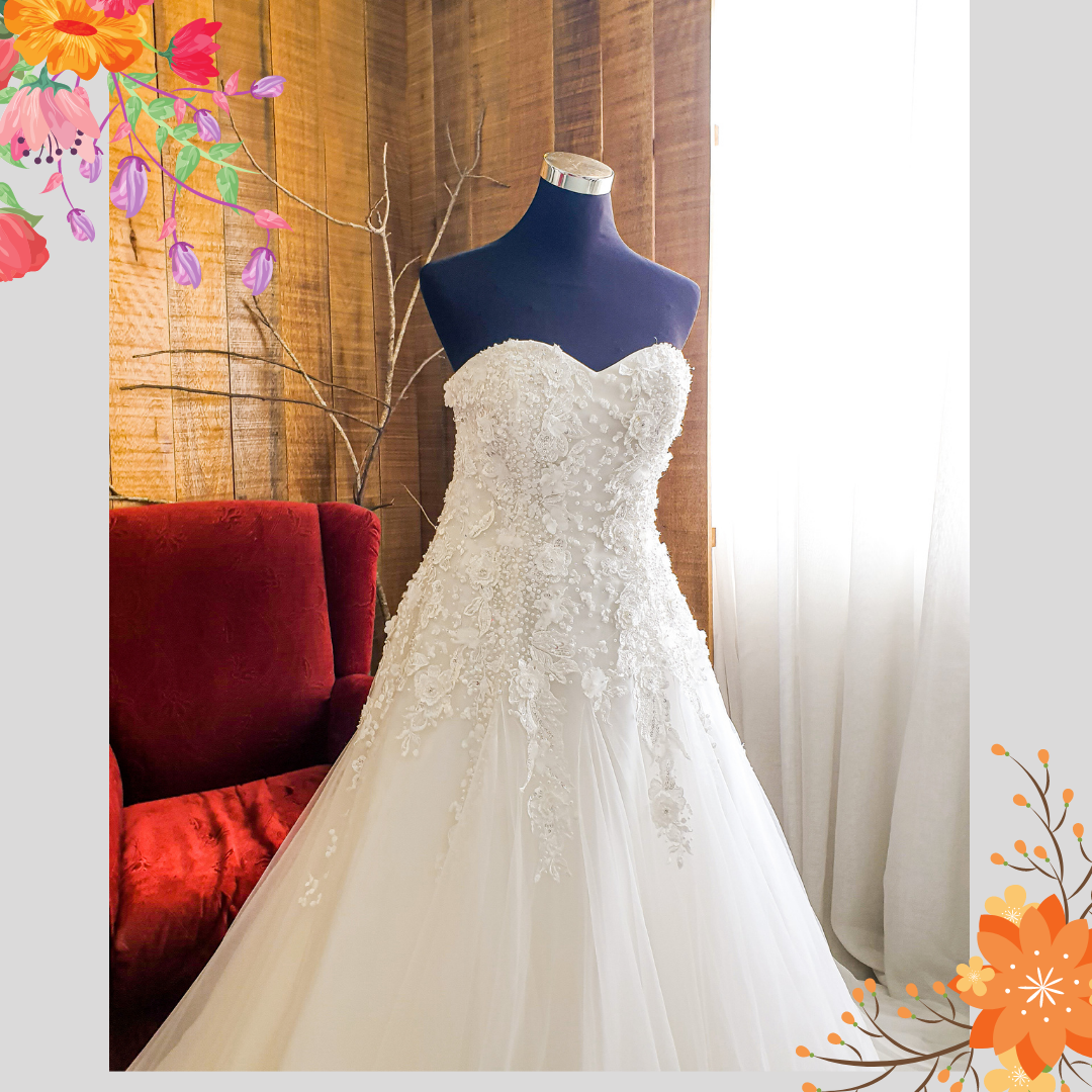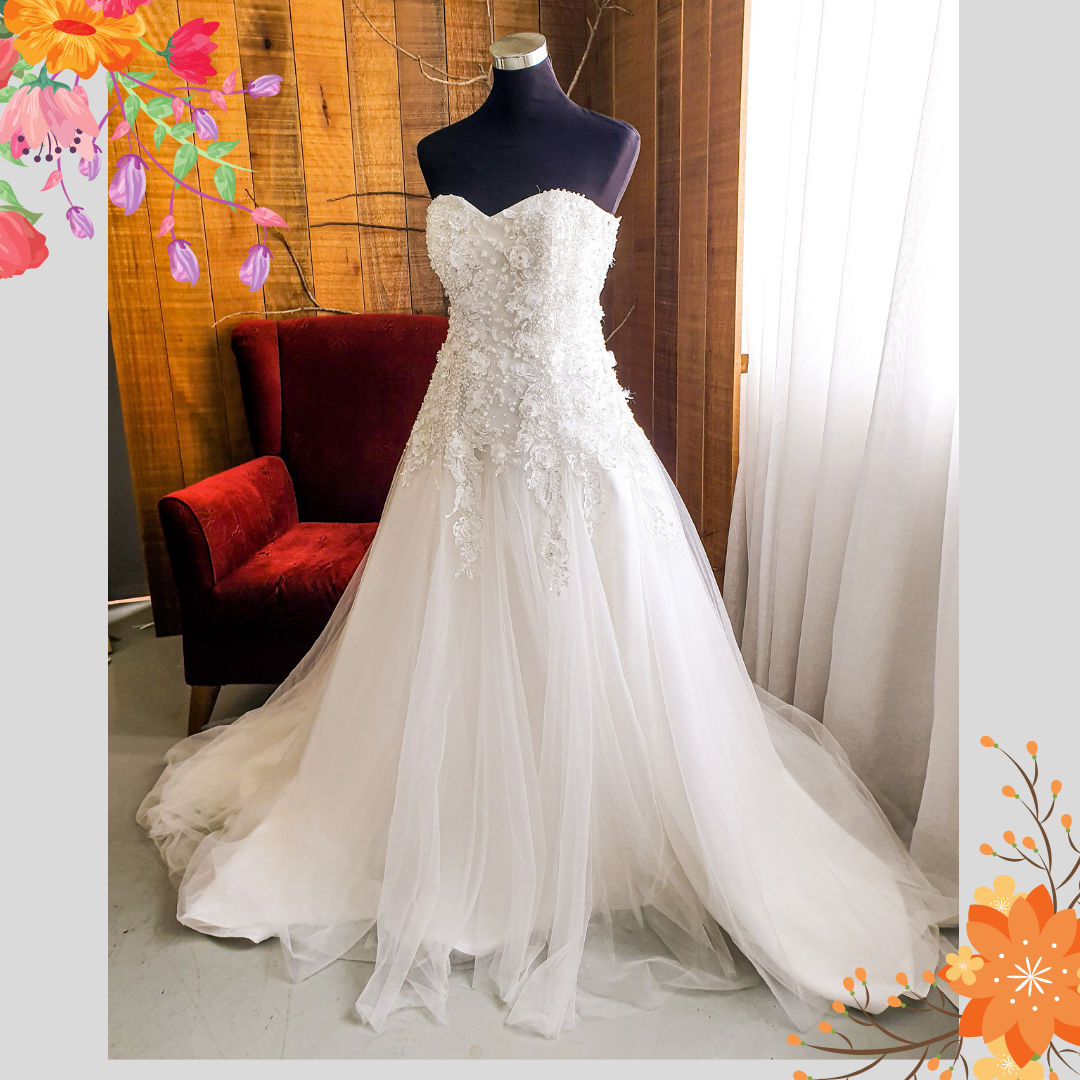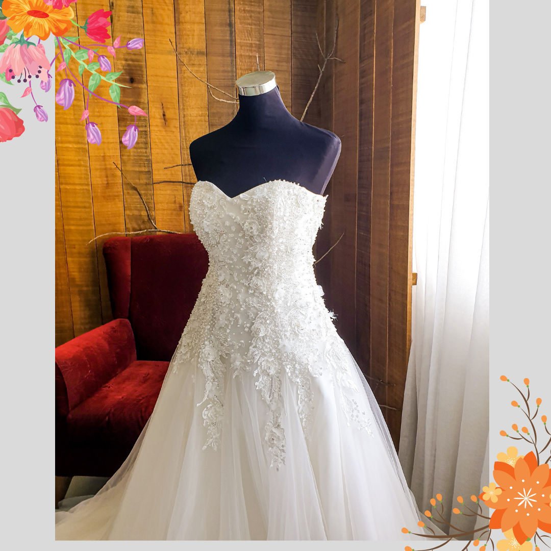 Featuring a beautiful lace embroidery with elegant beading details, this gorgeous wedding dress is both elegant and timeless!