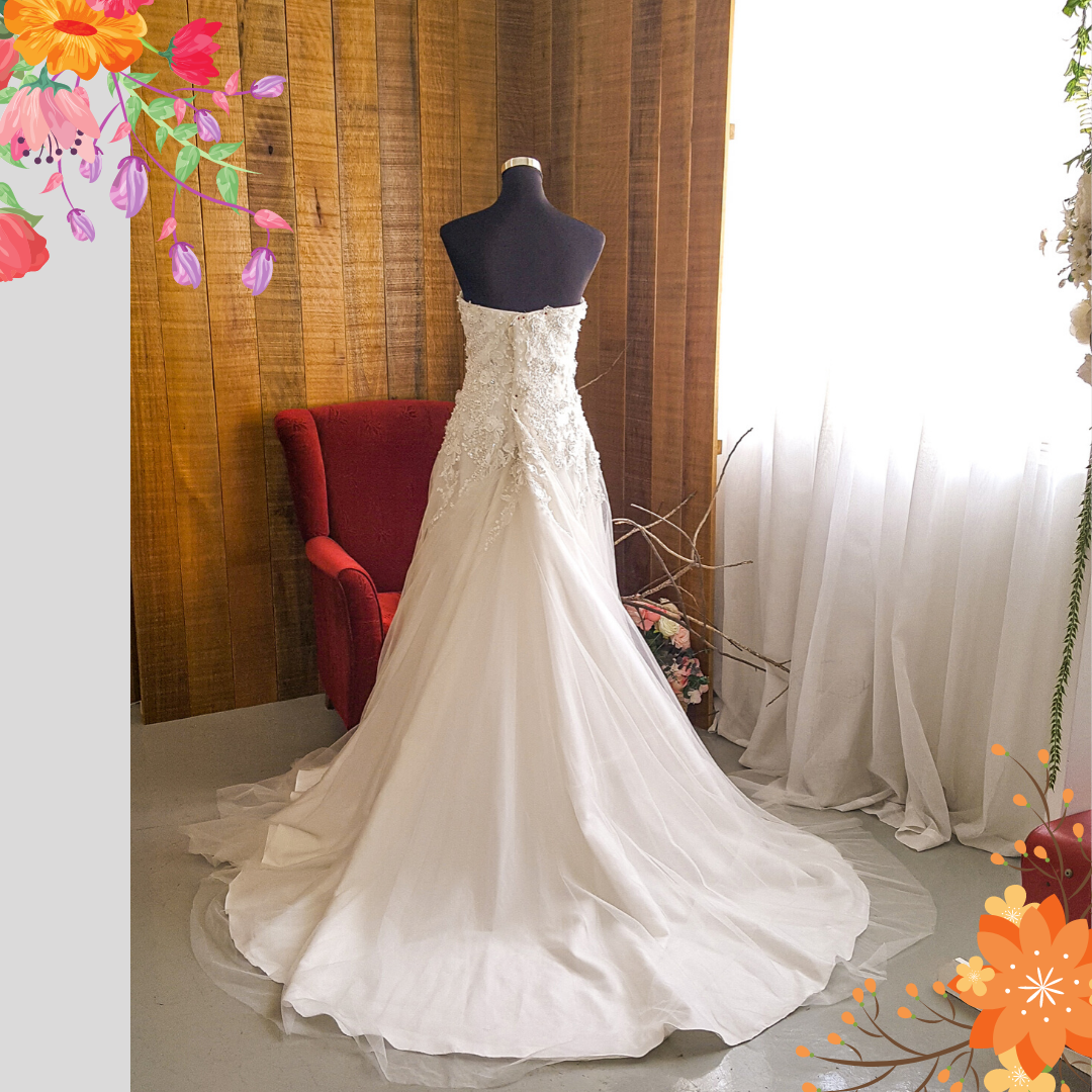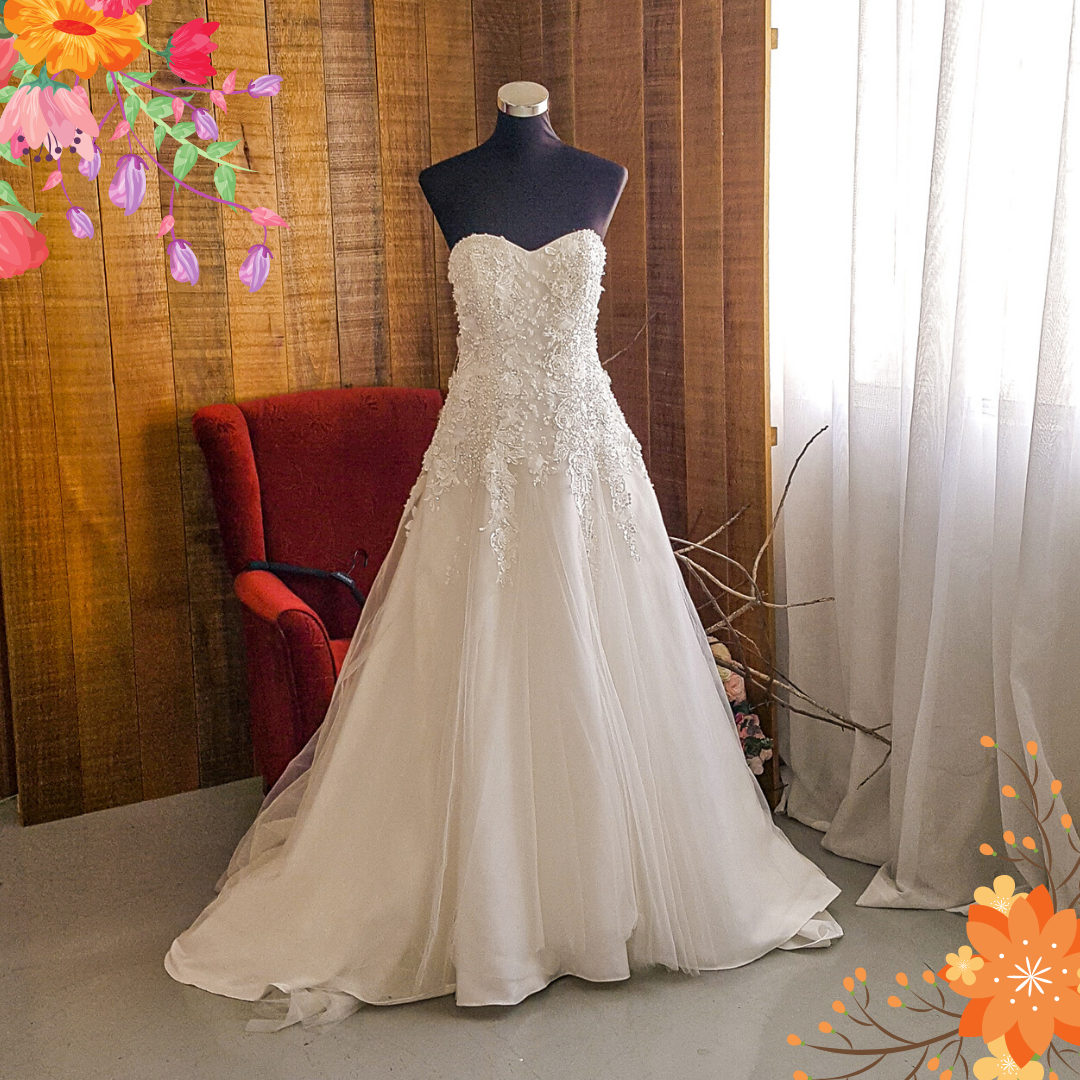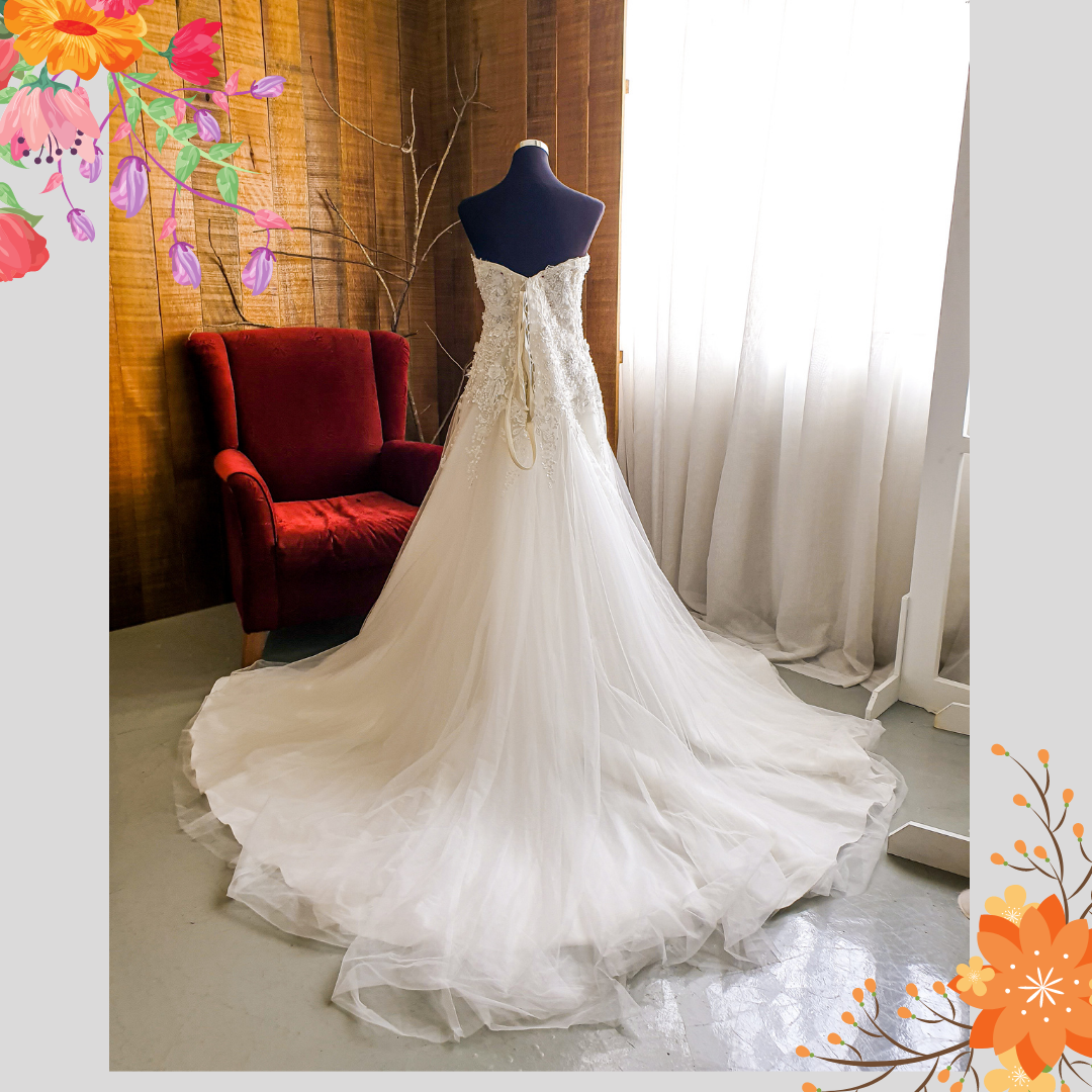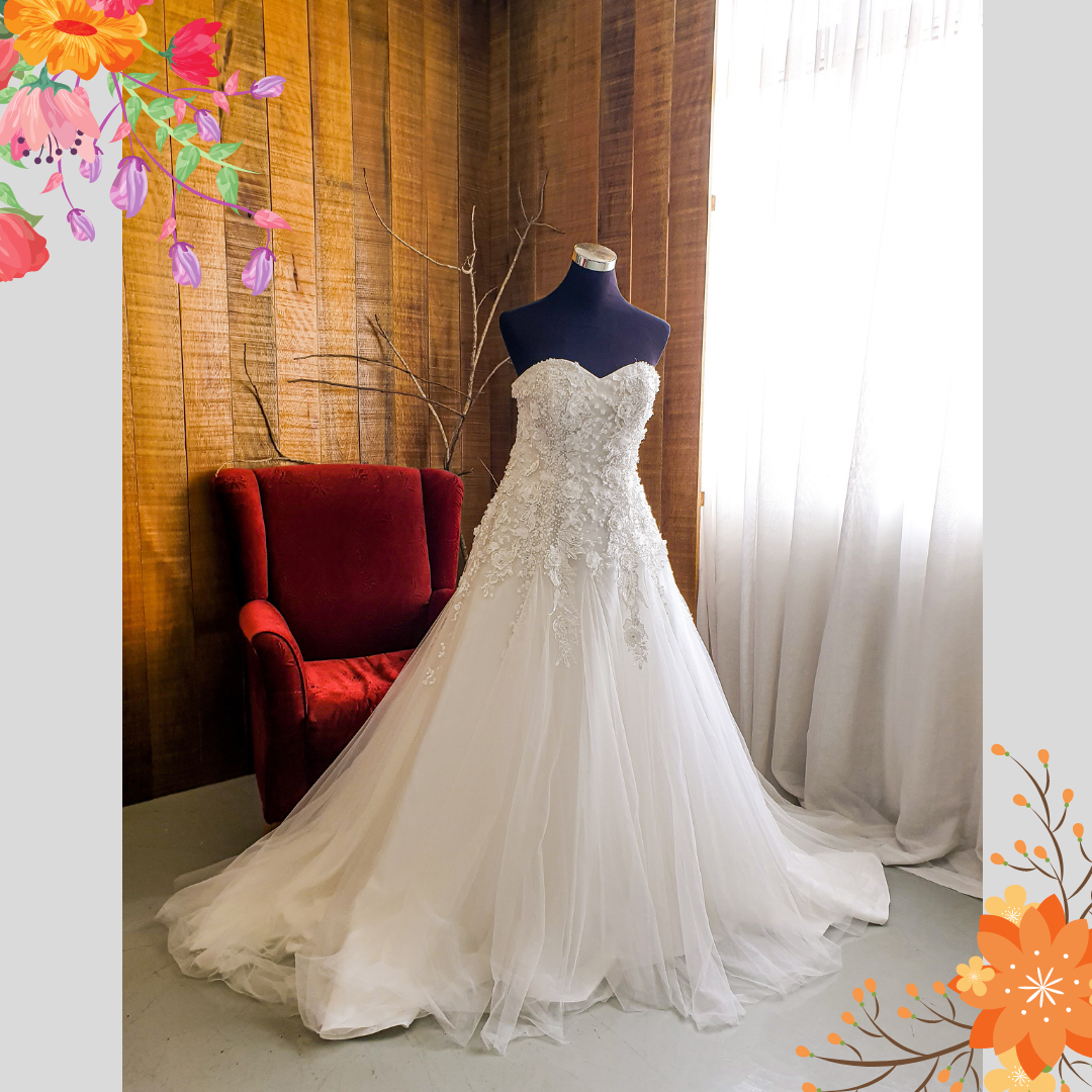 Featuring a beautiful lace embroidery with elegant beading details, this gorgeous wedding dress is both elegant and timeless!