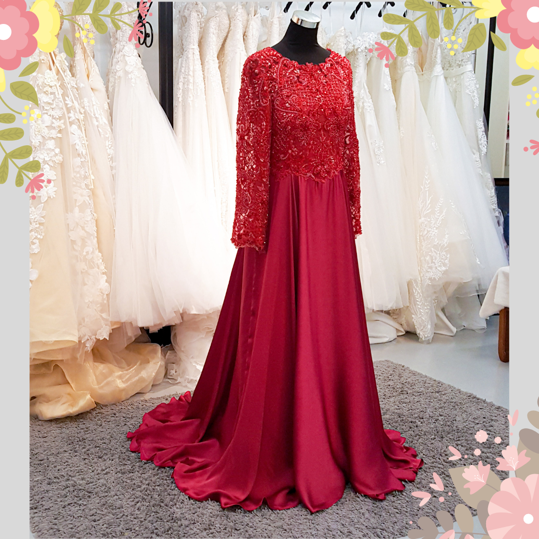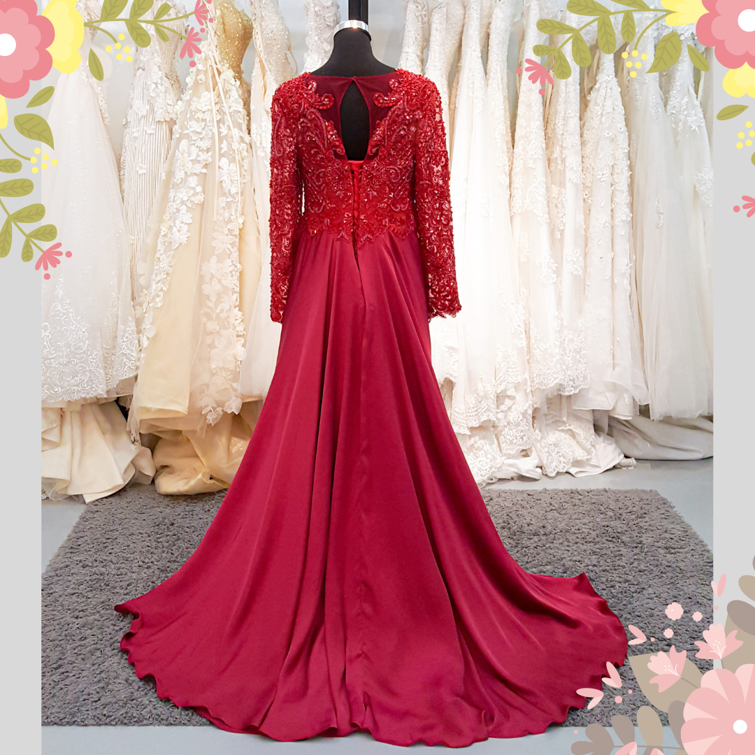 909LLEL01 Umie Maroon LS Chiffon Lace 2 Long Sleeves Wedding Dress Rental Kuala Lumpur, French Lace wedding Dress rental Malaysia,