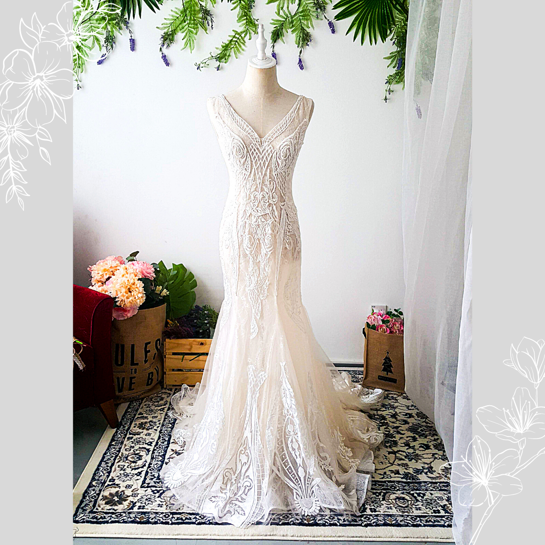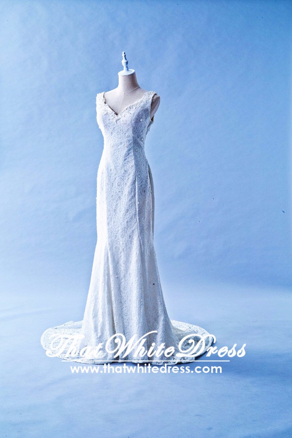 412W21 LL Vintage Low back Pearls V neck Strap Trumpet Mermaid Wedding Dress