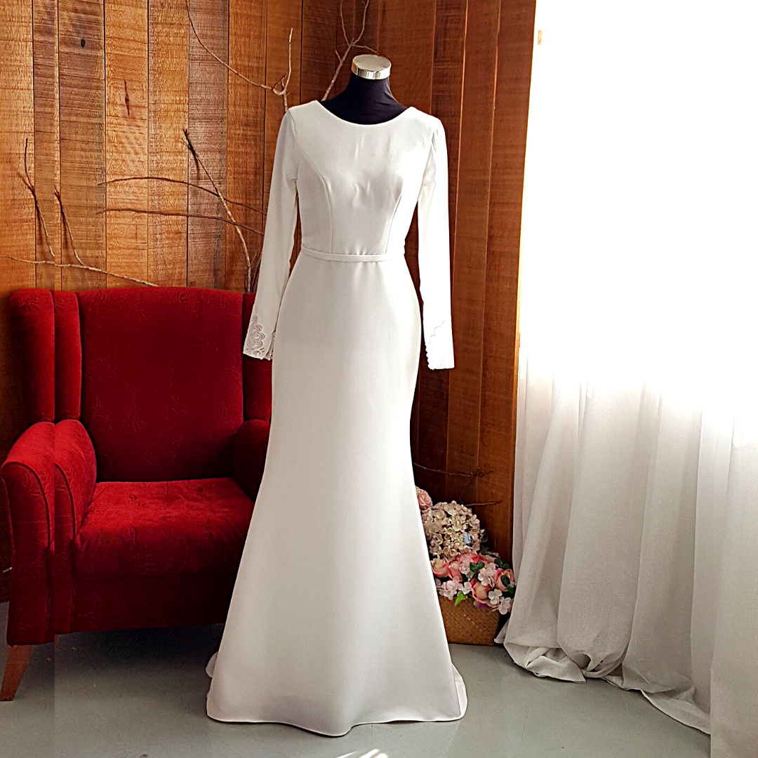 808BYW01 Minimalist Long Sleeves Wedding Dress Plain Crepe Meghan Markle V back Sheath Straight Cut Wedding Dress Malaysia