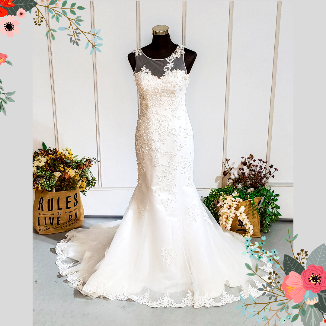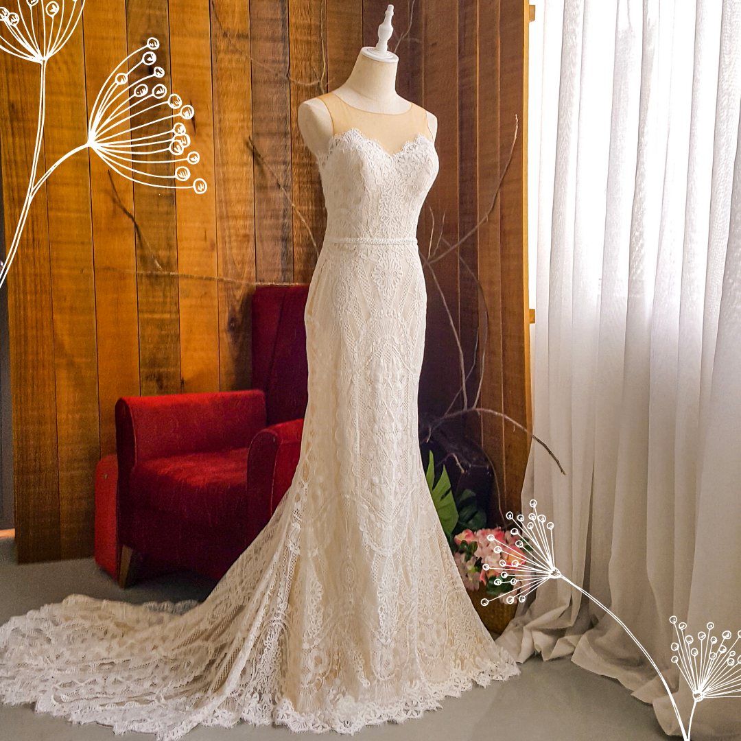 711LLW03 Mischa Boatneck illusion neckline in trumpet Alencon Chantilly lace