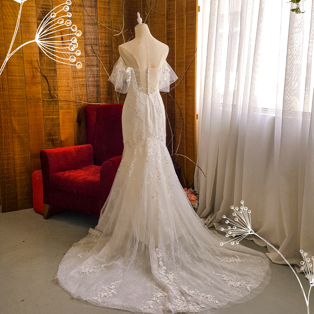 Gorgeous off shoulder floral wedding dress in beautiful French floral lace.