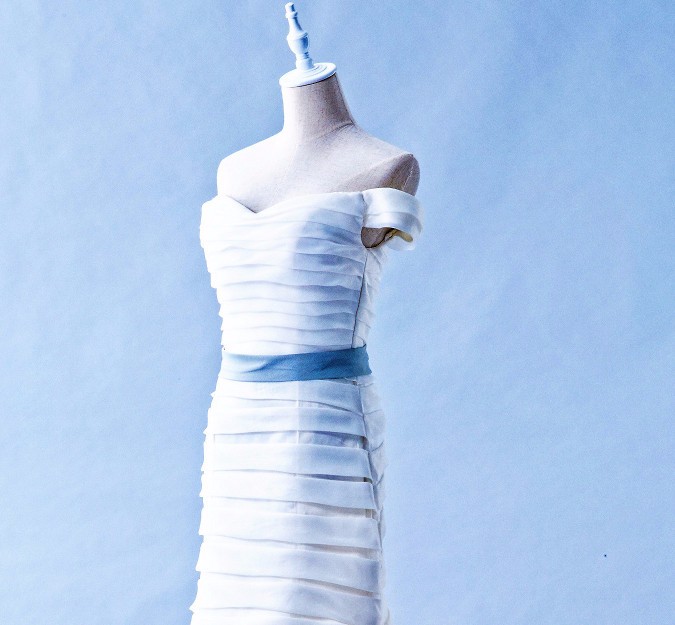 Off shoulder organza trumpet dress with modern pleated silk organza. Belt is detachable and can be accessorise with crystal embellised sash to add glamour to the design.