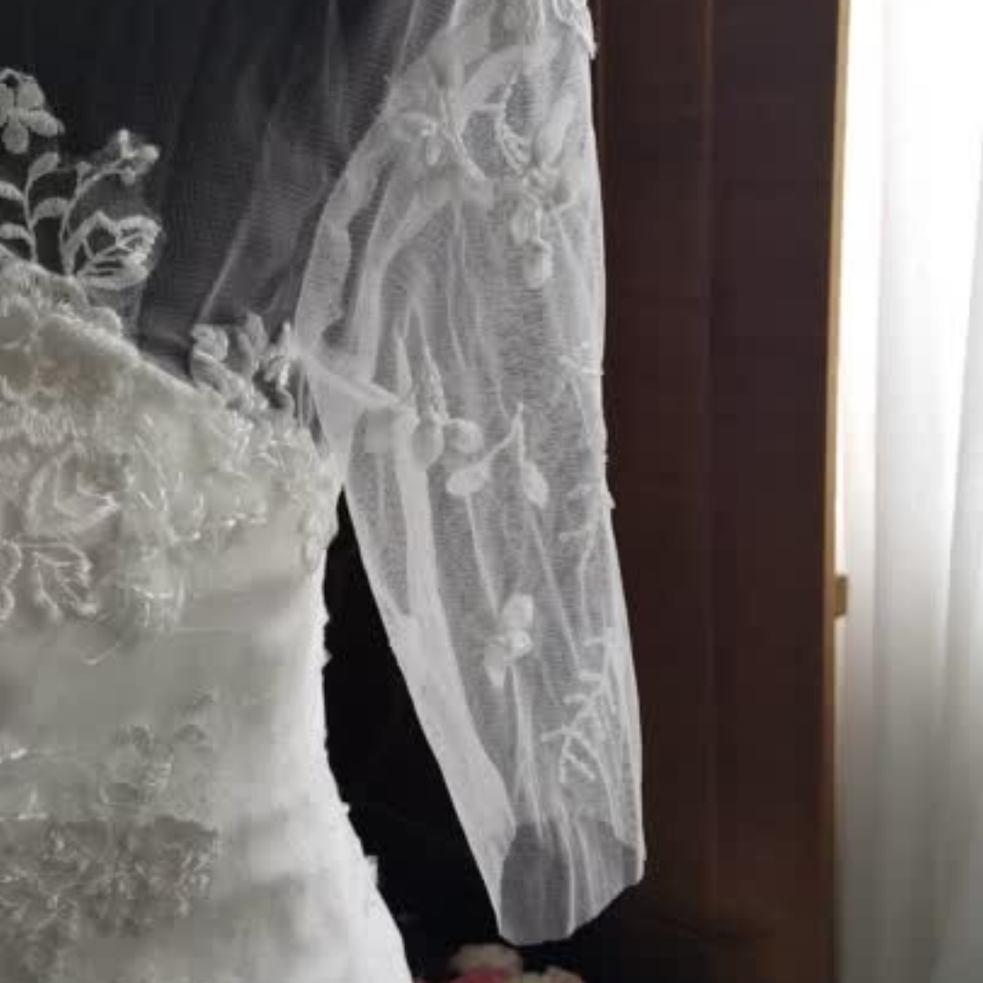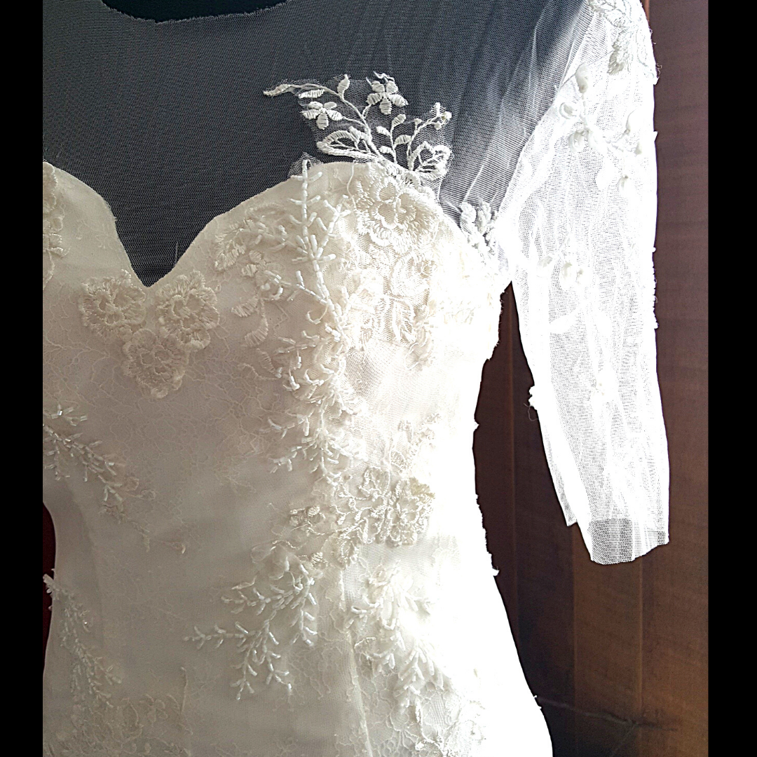 3/4 sleeves wedding dress with skin tone soft tulle net that creates see through illusion effect.
