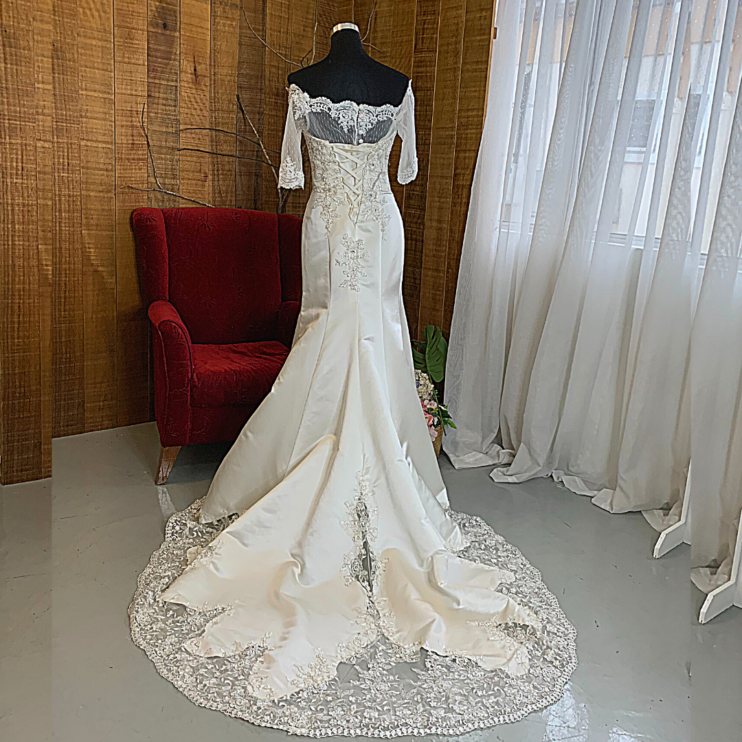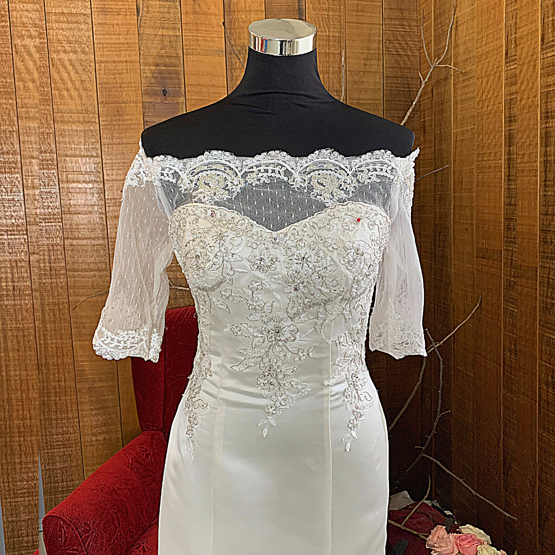 Couture design off shoulder 3/4 sleeves wedding dress in Duchess Satin and Silver corded French Alencon Lace.
