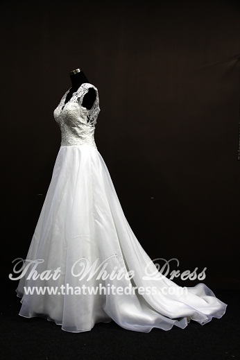 Strap dress with Deep V neck line. Corsetted bodice with a A line flare skirt in classy organza. Button details decorated the chapel train.
