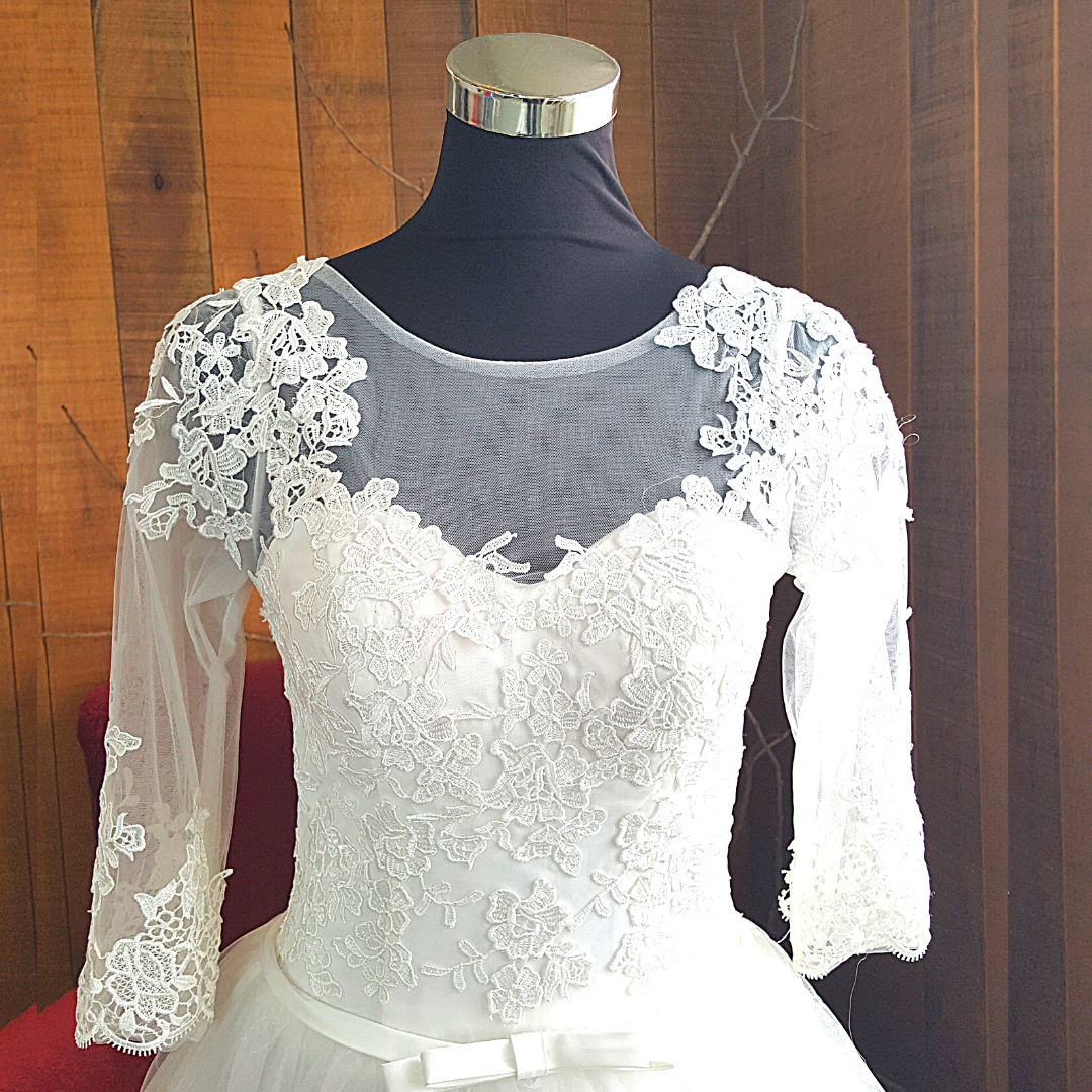 Couture design long sleeves illusion neck wedding dress in Princess style with beautiful French Alencon Corded Lace.