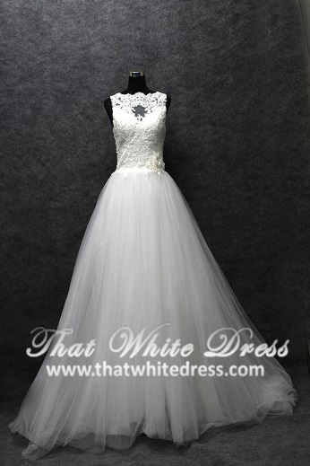 A line wedding dress illusioned neckline with big flare A line tulle skirt. Illusion neckline is embroidered in rich Belgian Alencon lace.